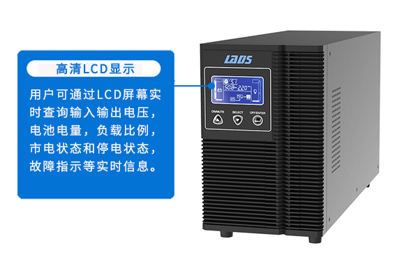 用戶(hù)可通過(guò)LCD屏幕實(shí)時(shí)查詢(xún)輸入輸出電壓,電池電量,負(fù)載比例,市電狀態(tài)和停電狀態(tài),故障指示等實(shí)時(shí)信息。