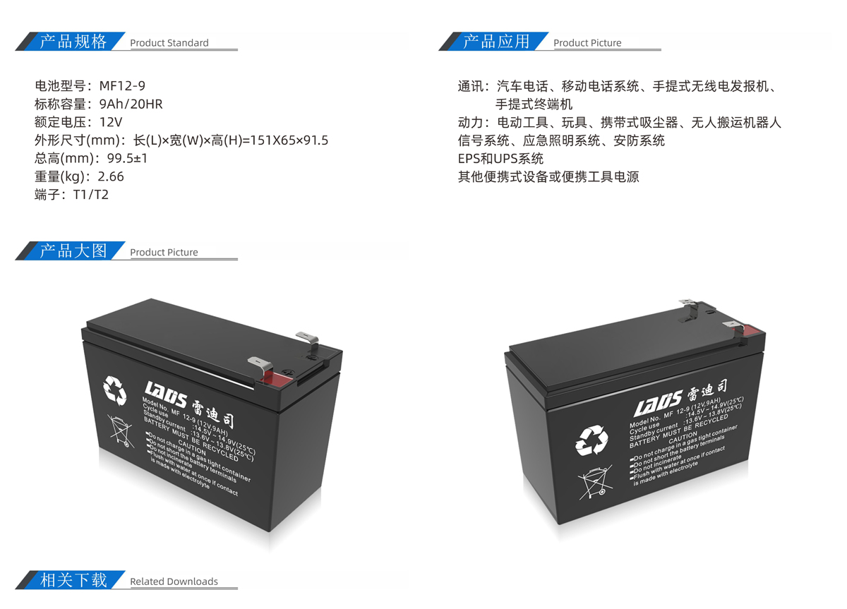 雷迪司MF12-9 12V 9AH閥控密封式鉛酸免維護蓄電池